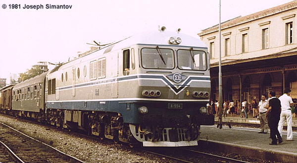 The A-551 class was built in 1982 by Electroputere in Craiova, Romania. They develop 4000 HP with a Resita-built 16-251R prime mover and saw service until July 1998 on the mainline between Athens and Thessaloniki with freights and heavy passenger trains. Though they have two control stands, only one was actually used - see the rear of #552 covered with diesel exhaust. The awesome units were turned after each service...