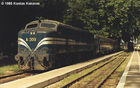 A-309 is seen at Edessa, pulling two Fiat Railcars on train