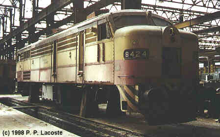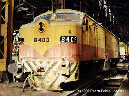 Pedro Pablo Lacoste tells: These FPD7 are in the Complejo Industrial Ferroviario Pérez of Rosario's town in the county of Santa Fe. The unit 8404 still possesses the rivets in its chassis. With the privatization of the Argentinan railways they were not given to any concessionaire. The government has it engaged to a club of rail fans that committed to reconstruct it. But the future of these two locomotives is still uncertain, it's a pain because they are in good state. The pictures were taken March 4th 1998.