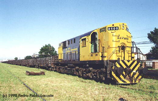 | Fresh painted 8505 is about to haul a long string of flatcars out of Haedo