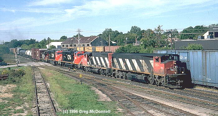 | 2104 in the lead of train 432 in Guelph, Ont. Trailing are 9428, 5667, 5665
