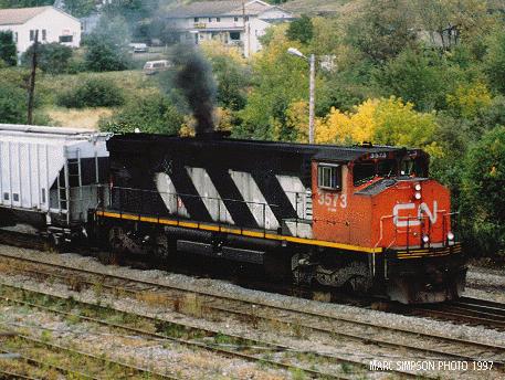 | 3573 loading as we like it best during its last months for CN in fall 1997. Marc Simpson photo |