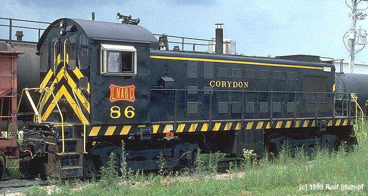 The Indiana shortline Louisville, New Albany & Corydon RR connects with Norfolk Southern at Corydon Junction. It rosters three ALCo S-type switchers. Two CAT D-398-engined ex-GT ALCo S-4, numbered 1000 and 1001. The latter is stored. The third is no. 86, also an ex-GT S-4. To be complete, a baby blue GE 45-ton #101 is also around.