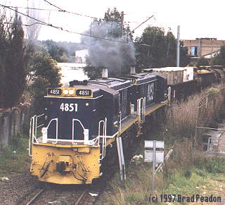 | 4864 leads three mates (4880, 4873, 4879) with a coal train for Hunter Valley through Maitland. Feb 28th, 1993 Phil Wormald photo | ![]() |