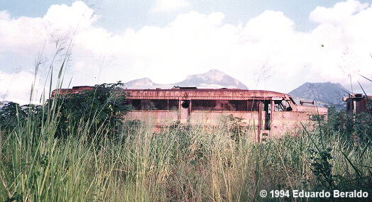 Cid Jose Beraldo reports: This was the status of the last FA in existence in Brasil, when this picture was taken on May 27, 1994. Nr. 3207 was spotted at RFFSA's Engenho de Dentro workshops and this was in fact the last time I saw her, surrounded by high grass and with few chances of surviving. At last notice, the engine is still sitting around but, with the years more of exposure to the elements, I believe it is now beyond salvation. Photo by Eduardo Beraldo (my son, then only 11 years old). |