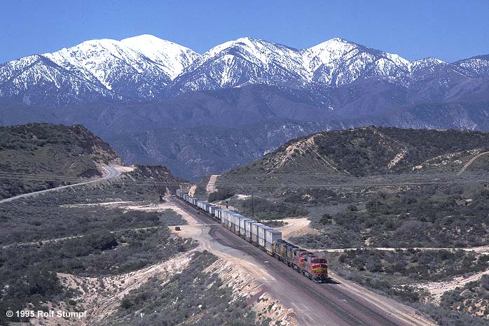 ATSF 568 (8-40BW), 504 (8-40BW), 5517, 5255 with a doublestack&intermodal hotshot, Cajon Pass Summit, March 30, 1995. The San Gabriel Mountains are still snowcapped and the Summit not yet fenced...Rolf Stumpf photo