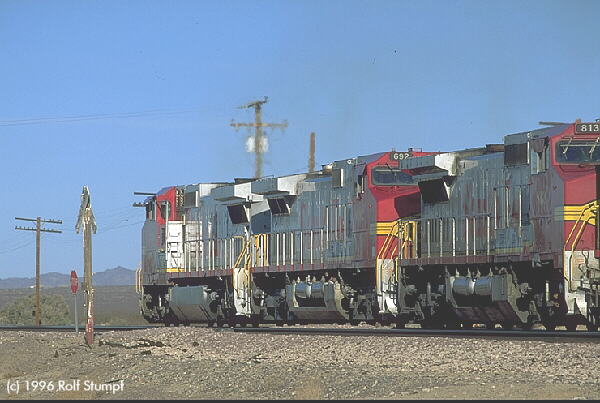 Going, going... gleaming Warbonnets (8-41CW #936, 9-44CW #692, 8-40CW #812) in the Mojave desert (Essex), November 8th, 1996. Rolf Stumpf photo