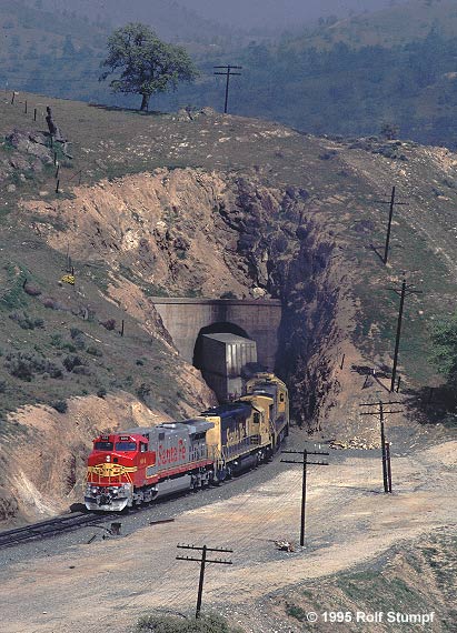 Tight fit one might say. The doublestack train needs the full tunnel profile and an edge more... Tehachapi mountains, tunnel 10. 9-44CW #694 leads 5087, 9526 (U36CM) and 5833 enroute to Mojave. April 1st, 1995. Rolf Stumpf photo