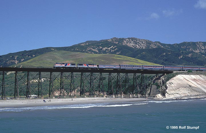 Amtrak "Pepsi Cans" 505+506 (P32-8BWH) lead the northbound "Coast Starlight" over the Gaviota trestle, April 15th, 1995. This photo was taken from a wooden pier. Rolf Stumpf photo