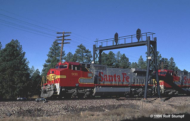 BNSF 931 (8-40CW) with an eastbound hotshot in the Kaibab Forest near Williams AZ, November 10th, 1996. Rolf Stumpf photo