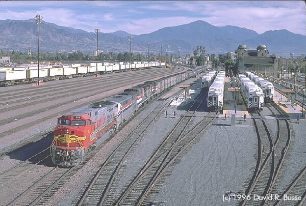 BNSF 688 (9-44CW) leads an AMTK Genesis and two "Pepsi Cans" on late-running Amtrak train #3 "Desert Wind". San Bernardino on January 6th, 1996. David R. Busse photo