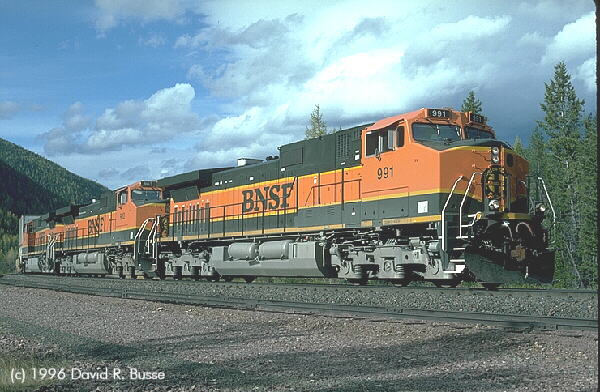 Three sparkling new "pumpkins", 9-44CW with 991 leading 963 and another near Glacier Park, Montana, October 12th, 1996. David R. Busse photo