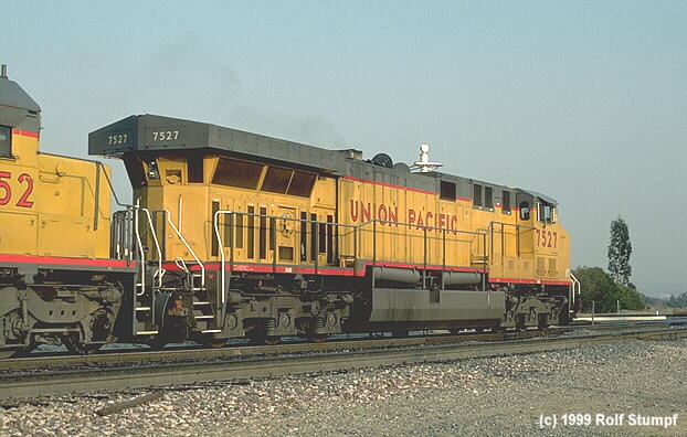 UP 7527, a brute AC6000CW, is on the point of a hot westbound intermodal short of San Bernardino, March 24th, 1999. Rolf Stumpf photo